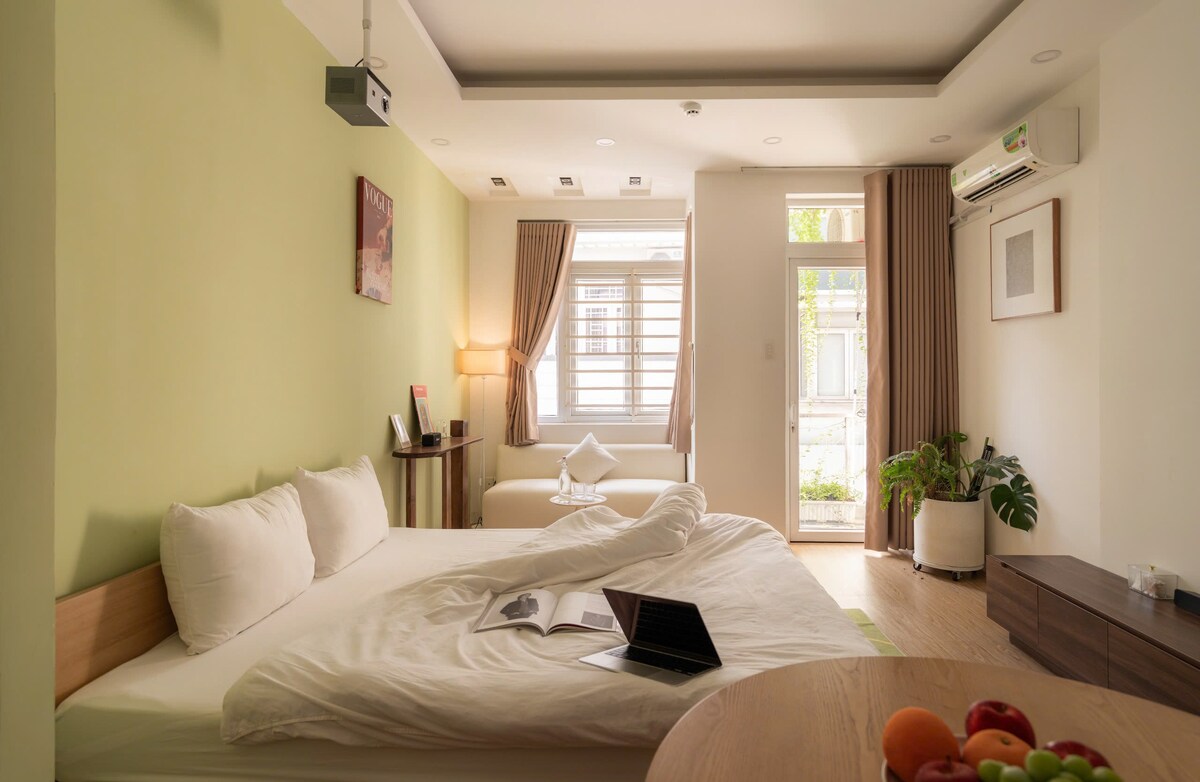 Vietnamese-Mediterranean Studio in central: • 2 km to Tan Son Nhat Airport & Phan Xich Long food street • 3 km to District 1 & major attractions, 4 km to Notre-Dame Cathedral Surrounded by popular Vietnamese eateries • Spacious bed (up to 3 guests) • Modern bathroom with bathtub & toiletries • Parking for cars & motorbikes • Café downstairs & photogenic corners • Projector, water purifier, coffee machine Enjoy thoughtful hospitality blending international touches with classic Vietnamese charm.