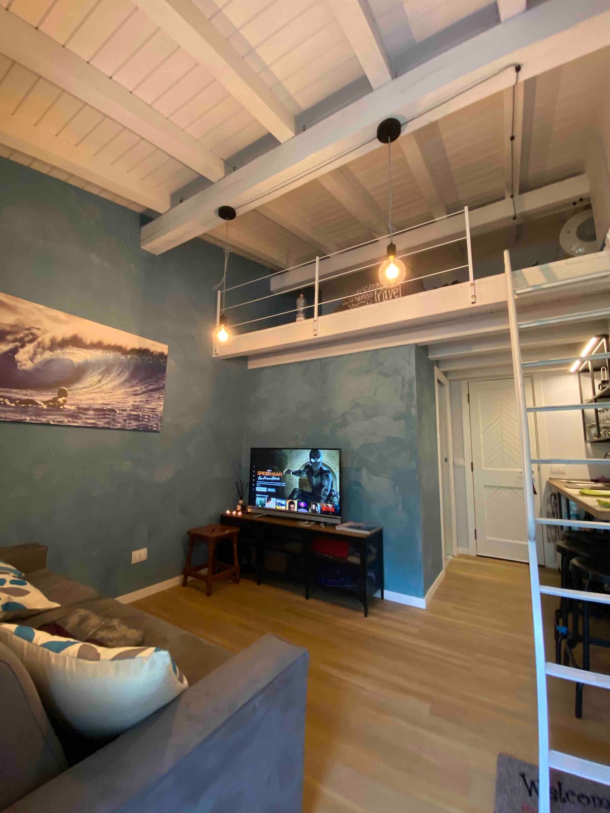 Base di appoggio per poter vivere a pieno tutto ciò che offre il territorio. Sito in un Residence privato all’interno di un parco di ulivi e castagni, con accesso privato al lago. Monolocale di 20 mq, ristrutturato in stile moderno nel 2022, Wi-Fi gratuito connessione debole, parcheggio privato, soppalco con letto matrimoniale raggiungibile con scala a pioli, bagno con doccia, salotto con tavolo richiudibile e Smart tv, piccola cucina attrezzata. Balcone esterno vista lago, tavolo e sedie