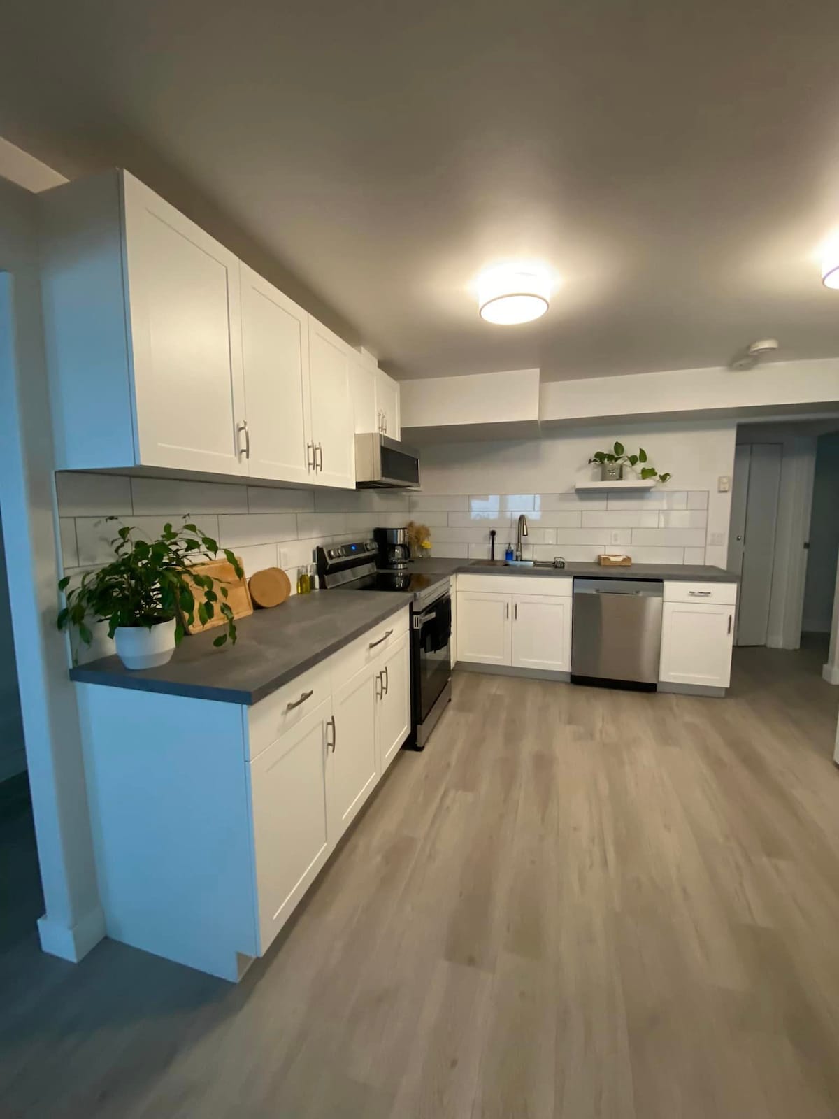 Questa accogliente e moderna suite con 1 camera da letto e 1 bagno nel seminterrato è luminosa e spaziosa e offre tutto il necessario per rendere il soggiorno il più confortevole possibile. TV da 70 pollici con canali via cavo e Netflix, ampio divano componibile con letto matrimoniale estraibile, wifi, aria condizionata centralizzata, lavanderia in loco, lenzuola di qualità con biancheria da letto extra. Tante grandi finestre che lasciano entrare molta luce naturale e uno spazio di lavoro dedicato con vista sul cortile sul retro. Parcheggio gratuito. Patio privato e possibilità di fumare all'aperto.