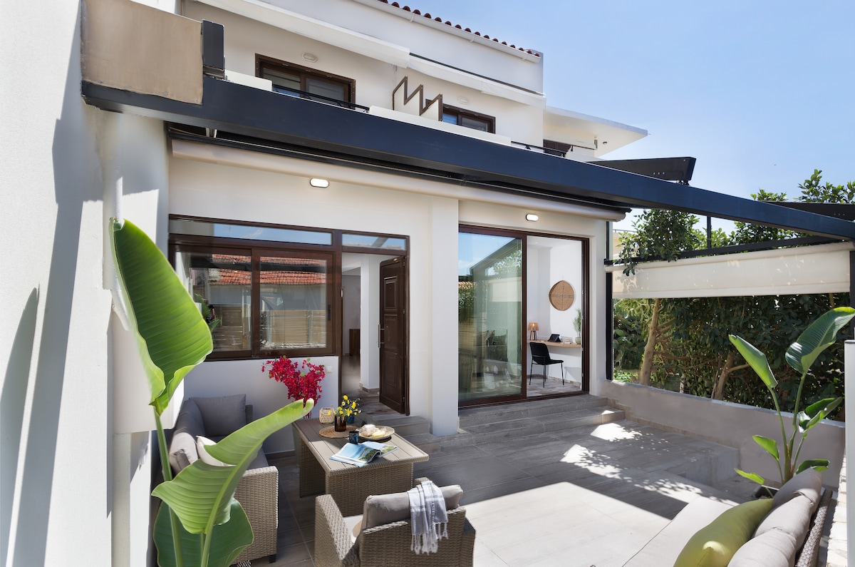 Rilassati e ricaricati in quest'oasi di quiete ed eleganza, a soli 5 minuti di auto da 4 spiagge e con facile accesso per scoprire la Creta occidentale. Questo monolocale indipendente in un uliveto e agrumeto è ideale per godersi la natura in un ambiente confortevole a soli 10 minuti di auto dal porto antico di Chania. Splendida vista sulle Montagne Bianche e sulla valle di Chania sottostante.