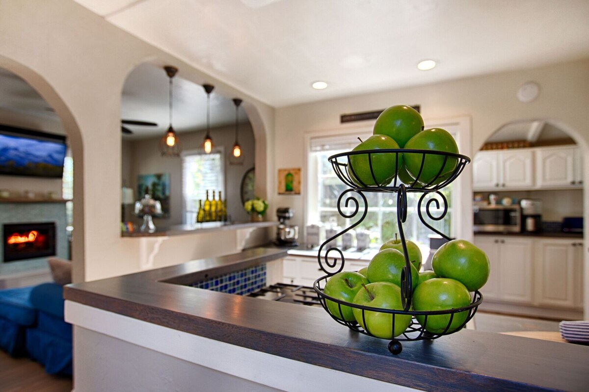 Enjoy a high-touch, yet private casita near UCSC. Curl up with a book in your red leather armchair in the beautiful living room featuring down, Restoration Hardware furnishings and a gas burning fireplace. In the evening, take a seat on your private patio beneath a leafy pergola and enjoy a glass of wine at this historic, Spanish-style casita. Some of the BEST bakeries, natural grocery stores, wine tasting, shopping, beaches and restaurants are all a short walk/bike ride or drive away xx