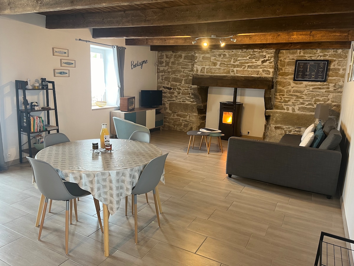 In un tipico casale del Pays Bigouden, vi diamo il benvenuto nella vecchia stalla, indipendente dal resto della casa. Ristrutturata nel 2014 in uno spirito di sobrietà e rispetto per l'antico, potrete godere al piano terra di un soggiorno con stufa a legna e cucina attrezzata. La terrazza che dà sul giardino è in parte coperta. Al piano superiore, una camera con un letto di 140 e una camera con un letto di 90 così come il bagno e servizi igienici. Il mare a 2 km.