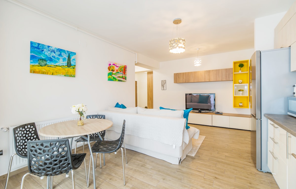 Ti diamo il benvenuto nel tuo accogliente rifugio a Brașov! Questo appartamento con 1 camera da letto completamente attrezzato unisce comfort e stile, perfetto per un soggiorno rilassante. Situato a soli 15 minuti dal centro città e a 5 minuti dal centro commerciale Coresi, con molti supermercati nelle vicinanze. Goditi le texture naturali, l'illuminazione calda e tutto il necessario per un'esperienza di casa lontano da casa. Ideale per coppie, viaggiatori singoli o famiglie (divano letto nel soggiorno e parco giochi per bambini accanto all'edificio).