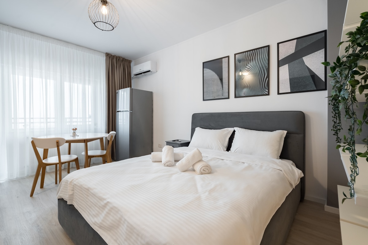 Il posto di cui hai bisogno per un volo in anticipo, una sosta o giornate rilassanti alle Therme Bucarest. Ti mettiamo a disposizione un monolocale in una posizione tranquilla, situato a 5 minuti dall'aeroporto internazionale Henri Coanda. È situato in posizione centrale nella città di Otopeni, con accesso a tutti i punti di interesse della città. (Therme Buc. Complex natație, Amethyst Center, Tiriac Collection) L'appartamento è collocato in un accogliente edificio con soli 9 appartamenti, cortile e parcheggio privato.