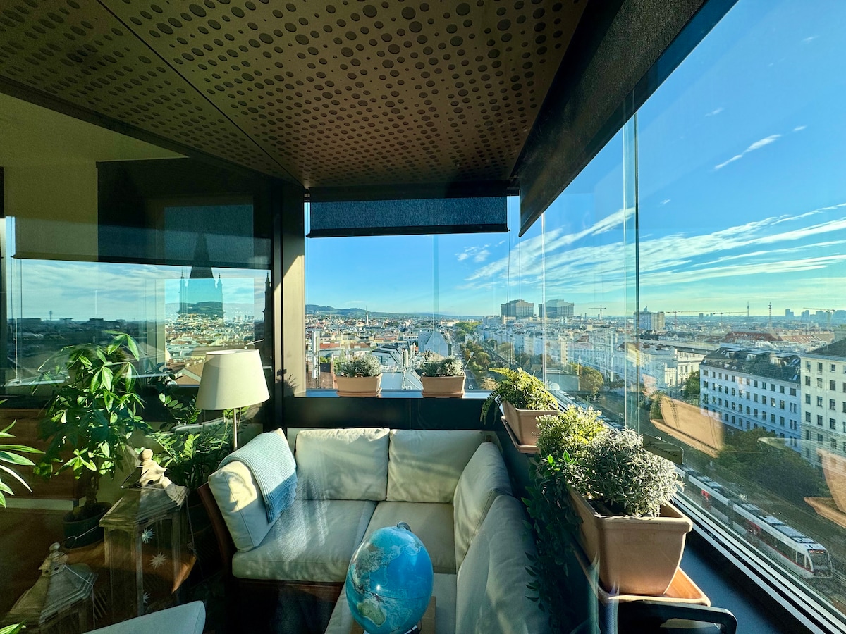 "Skyflats Vienna Sun View" is a phantastic Panorama Suite, Business Apartment and Holiday Home in one, fully furnished and serviced by tourism expert Wilfried Seywald. You can be guaranteed that you get a luxury flat for high-end living on Top of Vienna (9th floor, 75 m2) and in the City Center. Please have a look also on our other Skyflats "City View" and "Hills View.