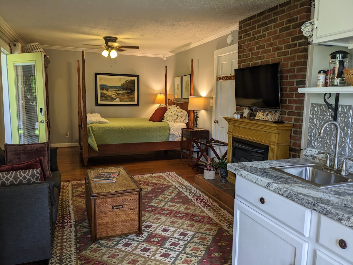 Tranquillo monolocale recentemente ristrutturato in un cottage di 75 anni su una strada di campagna, a soli 2,4 km dalle gallerie, dal teatro, dai negozi e dai ristoranti dello storico Tryon Village. Questo monolocale ben arredato dispone di letto matrimoniale, angolo cottura e portico privato di 23 metri quadrati con vista sul cortile anteriore e sul fiume Pacolet. Quartiere sicuro e tranquillo. Ingresso indipendente, parcheggio designato. A meno di 47 km dagli aeroporti, 21 km dal TIEC, 11 km dal FENCE, 5 km dall'ospedale e 0,8 km dalla Tryon Art & Crafts School. Benvenuti!
