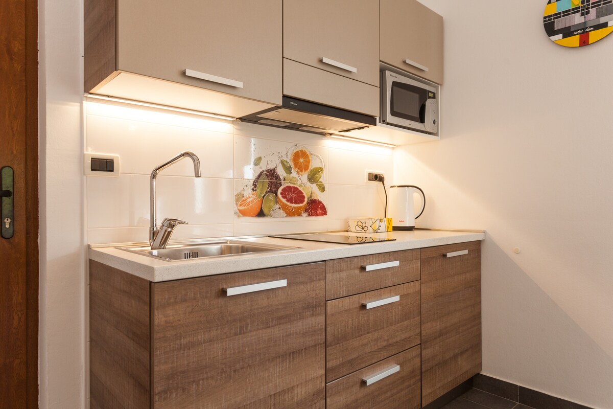 Un accogliente monolocale di 25 m2 situato nel quartiere storico di una vecchia villa austro-ungarica, una delle strade più famose di Pola, ex quartiere elitario della marina austro-ungherese, dove vivono ufficiali di alta classe. L'appartamento è arredato con stile per farvi trascorrere un soggiorno confortevole a Pola.