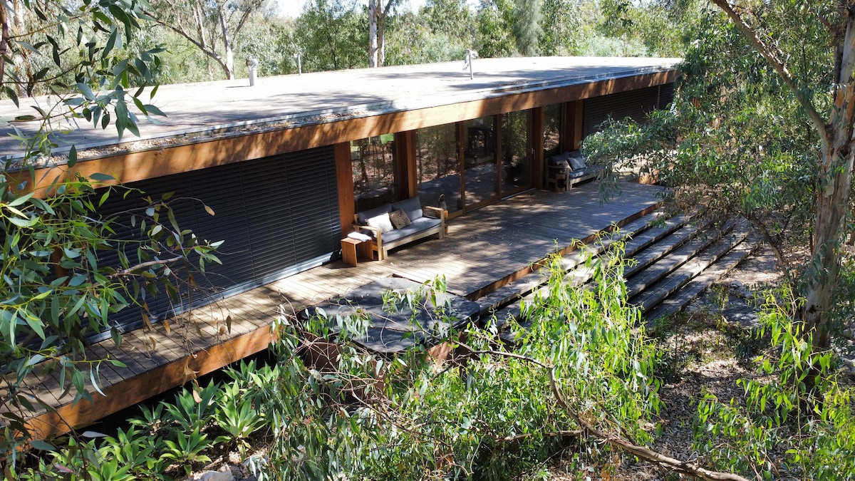A treehouse dream reimagined for grownups on your private acre of mature trees — panoramic windows blur indoor and outdoor boundaries while wooden slats offer privacy for outdoor showers and a shared open-sky hot tub. Architecture and nature blend seamlessly in this elevated, single-storey design, crafted with sustainable materials and sophisticated simplicity. The central living heart and bedroom suites at each corner provide an ideal layout for groups seeking both togetherness and seclusion.
