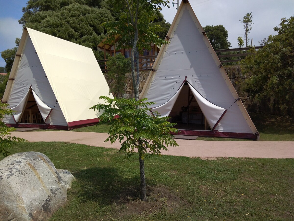 In questo spazio sentirai un forte legame con la Natura. È un luogo speciale grazie alla sua vista sul mare e al tramonto sull'orizzonte dell'Oceano Atlantico. Potrete rilassarvi all'ombra di grandi alberi, vicino al ruscello, e ascoltare il suono dell'acqua che passa attraverso le piccole cascate che si trovano qui. All'interno delle tende si possono sentire i suoni della natura e allo stesso tempo sentirsi molto a proprio agio. Potrete anche godere della piscina a forma di lago con cascata circondata da pietre naturali.