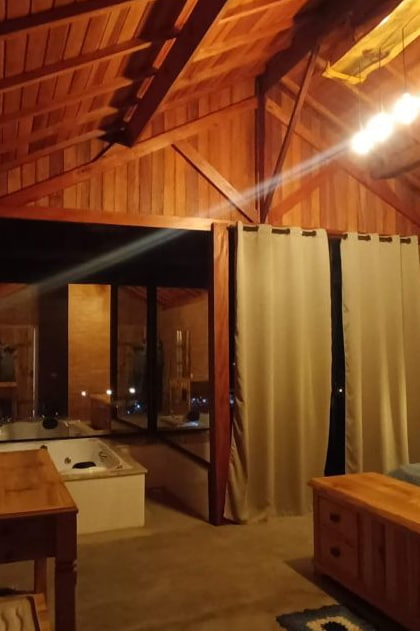 Venite a soggiornare nella Cabana Mundo Novo. L'unica con un esclusivo pavimento in vetro con cromoterapia al centro della stanza. La Cabana ha un design unico in mezzo alla natura a Gonçalves-MG. Dalla cima della montagna, con il diritto a un incredibile tramonto senza rinunciare al comfort e all'intimità. Situata a 7 km dalla città, in una zona verde. Approfittate anche per rilassarvi nell'idromassaggio esterno, dondolare nell'amaca, fare un barbecue o semplicemente riscaldarvi nel fuoco a pavimento o nel riscaldatore.