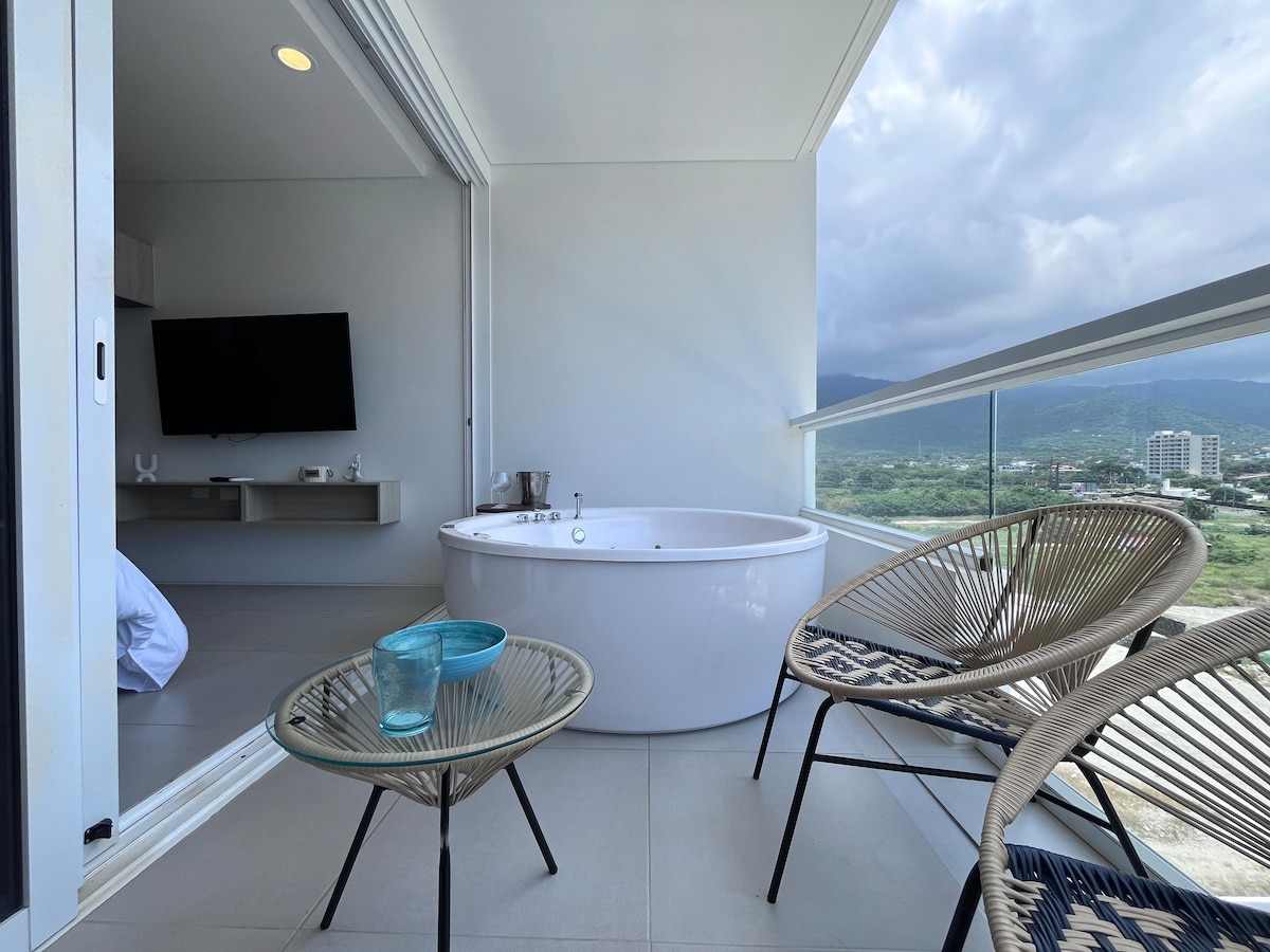 Rilassati in un rifugio unico e tranquillo con vista sull'oceano e una vasca idromassaggio privata all'interno della lussuosa suite dell'appartamento, goditi una TV da 70 pollici e una cucina attrezzata. Situato in un esclusivo condominio nella zona turistica di Santa Marta, a soli 3 minuti a piedi dalla spiaggia più bella di Bello Horizonte, ideale per coppie o 3 o 4 persone: letto matrimoniale con materasso di lusso + letto matrimoniale. Pulizia giornaliera gratuita. Goditi un hotel a 5 stelle e prova qualcosa di diverso. Prenota ora!