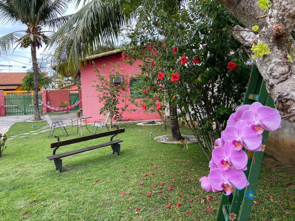 Relaxe nesse recanto delicioso no tranquilo bairro Bosque, um espaço de veraneio familiar, não um hotel. O que tem: - Ar condicionado - Wi-Fi de 300 mb - Smart TV 32" - Uma cama de casal e uma caminha de solteiro embaixo. - Roupas de cama e banho - Cozinha compacta (cooktop, geladeira, sanduicheira) - Estacionamento no quintal Possui jardim gramado onde você pode pegar sol, ouvir música e olhar as estrelas. Sinta-se em casa quando estiver aqui!