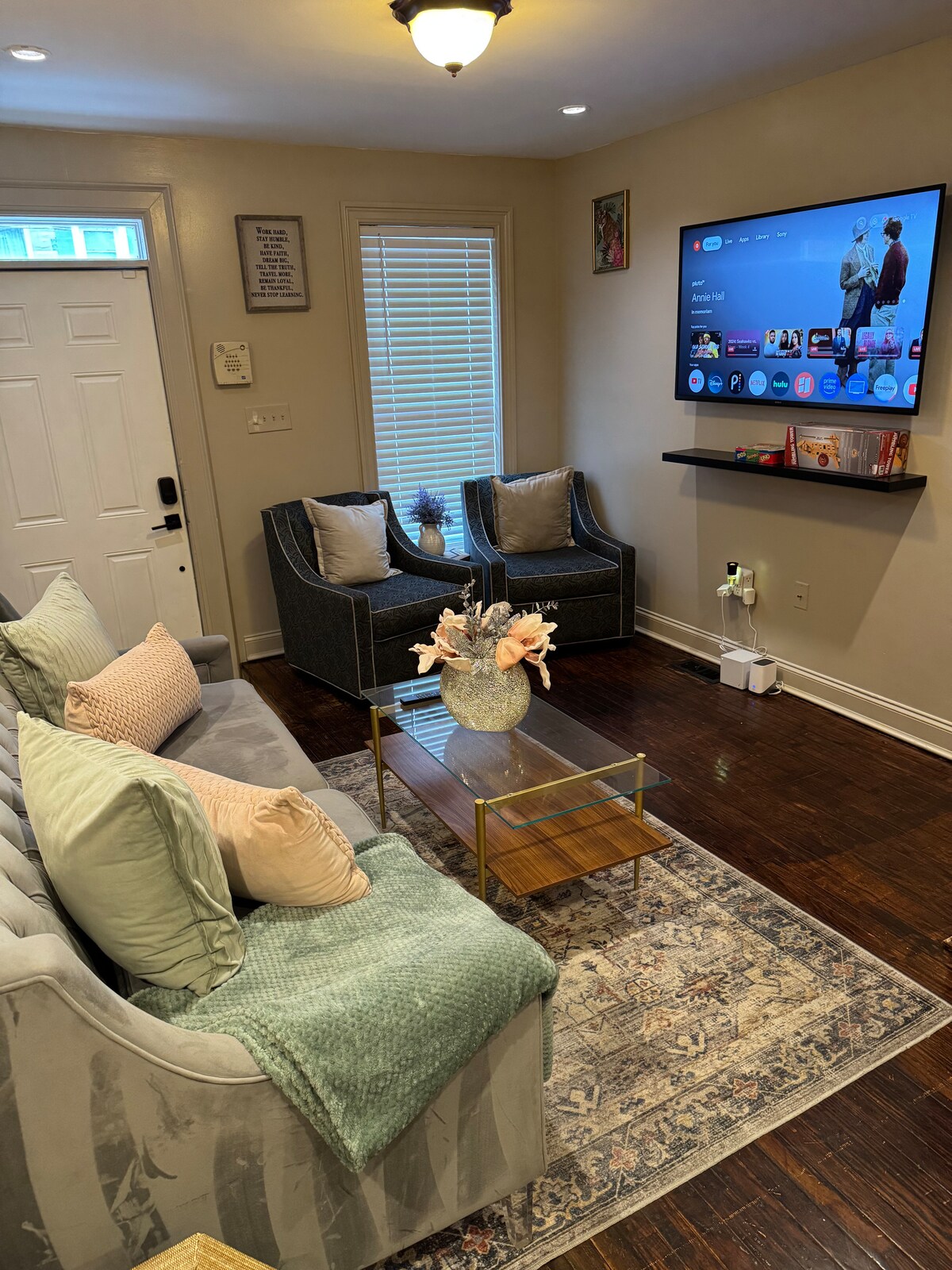 Welcome to your creative one bedroom, one bath retreat in Reservoir Hill, designed for peaceful getaways, staycations, or work trips. This art filled space blends historic charm with modern comfort and features multiple standing and seated workstations. Enjoy a functional bedroom with a Murphy bed for added space, a fully stocked kitchen, formal dining area, bar cart with vinyl player, balcony views, and thoughtful details throughout, perfect for rest, creativity, and photo worthy moments.