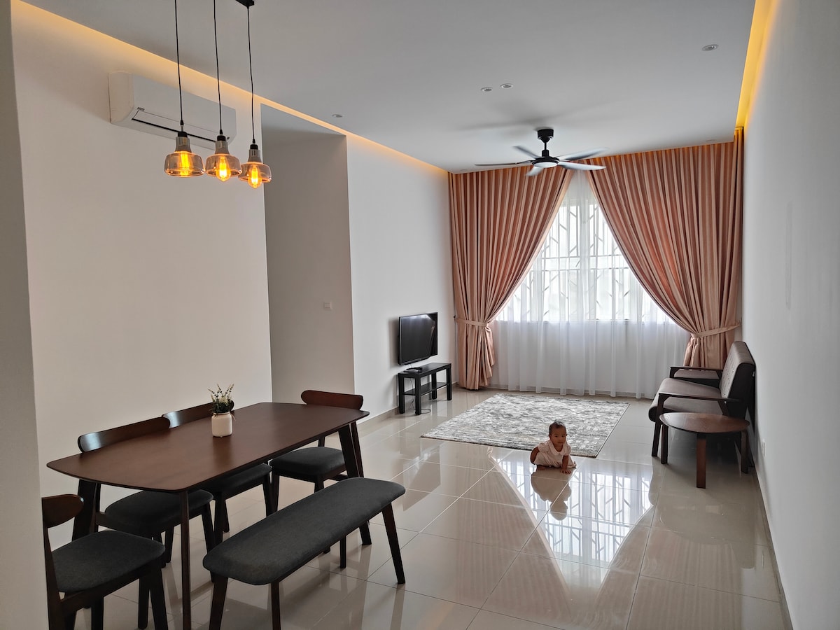 Presint 8, Putrajaya (3 camere da letto e 2 bagni) Un accogliente appartamento moderno, ideale per una famiglia di 5 persone. Camera da letto principale (letto matrimoniale, aria condizionata, bagno) Camera 2 (letto singolo, letto singolo estraibile) Camera 3 (letto singolo) Soggiorno (aria condizionata, Smart TV, bagno) Cucina attrezzata. Ferro da stiro fornito Servizi: Piscina Parco giochi Parcheggio - 2 posti Attrazioni nelle vicinanze: Ayer 8 - 5 minuti a piedi Ospedale Putrajaya, IJN - 7 minuti in auto Masjid Putra, PICC - 8 minuti in auto IOI Mall - 15 minuti in auto