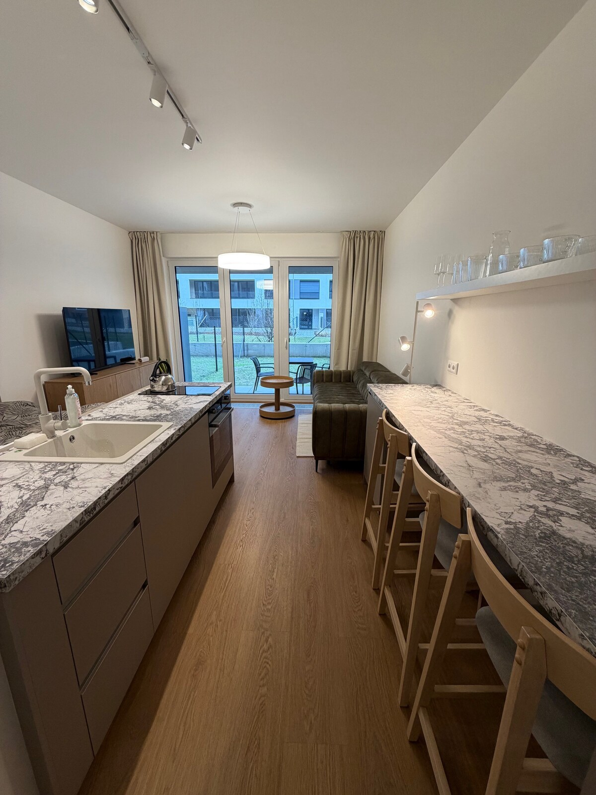 Soggiorna a Praga circondato da lusso, arte e design. Un luogo elegante e tranquillo, con tutti i servizi necessari, ti accoglierà calorosamente e ti permetterà di vivere comodamente nella parte residenziale più attraente della città. Non vediamo l'ora di ospitarti per un soggiorno a medio o lungo termine. La suite ben attrezzata ti accoglie con una fantastica cucina e sala da pranzo, una TV moderna con servizi Apple TV, O2 TV e Netflix, una camera da letto molto privata e accogliente (materassi di lusso, piumoni di alta qualità) e attrezzature per l'allenamento, come tappetino da yoga, manubri o corda per saltare.