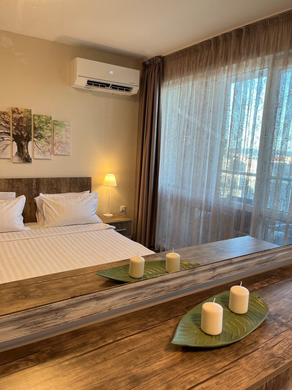 Appartamento panoramico in un quartiere tranquillo di Varna. Accesso all'aeroporto, al centro medico, alla piscina, al parco sportivo e al parco giochi, al centro commerciale, al mercato. Sistemazione in 2 camere - camera matrimoniale e divano letto matrimoniale 1,85x1,35 m. dotato di materassi top per il comfort. Aria condizionata, Smart TV, scrivania, Wi-Fi gratuito, culla (su richiesta). La cucina è dotata di forno a microonde, forno con fornelli, macchina per il caffè, frigorifero, congelatore e lavatrice. Inoltre, ferro da stiro, asciugacapelli, kit di pronto soccorso ed estintore. Parcheggio gratuito. Possibilità di fattura.