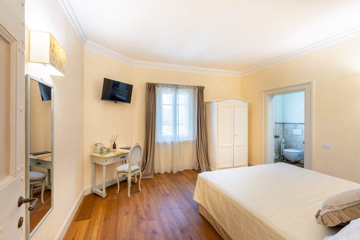 Suite vista giardino Elegante camera con vista sul giardino e sul lago, ampio bagno con vasca da bagno e doccia. Dotata di arredi del XIX secolo e letto in ferro battuto. Servizi in camera: vista giardino, cassaforte, aria condizionata, scrivania, riscaldamento, pavimento in marmo o in piastrelle, zanzariera, armadio/guardaroba, asciugacapelli, prodotti da bagno in omaggio, WC, bagno privato, vasca e doccia, telefono, radio, canali satellitari, TV a schermo piatto, minibar, frigorifero.