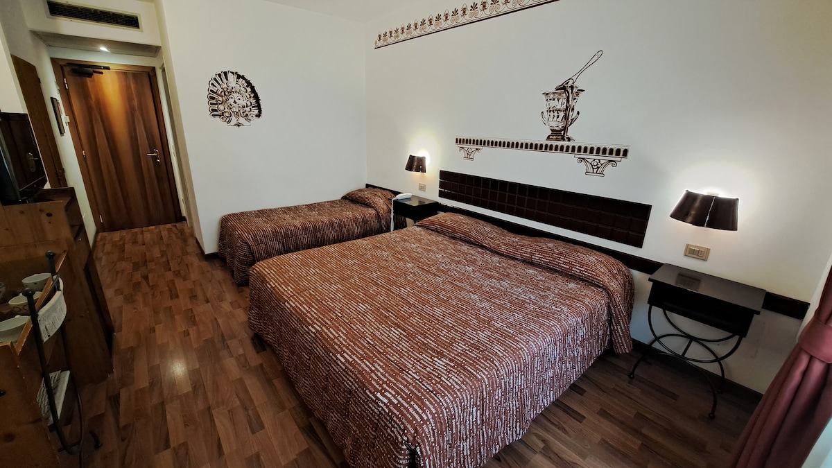 Camera con letto matrimoniale arredata in stile semplice e tradizionale ma dotata di tutti i confort: bagno privato con doccia, set di cortesia e asciugacapelli; TV a schermo piatto, aria condizionata indipendente, minibar, cassaforte e WiFi.