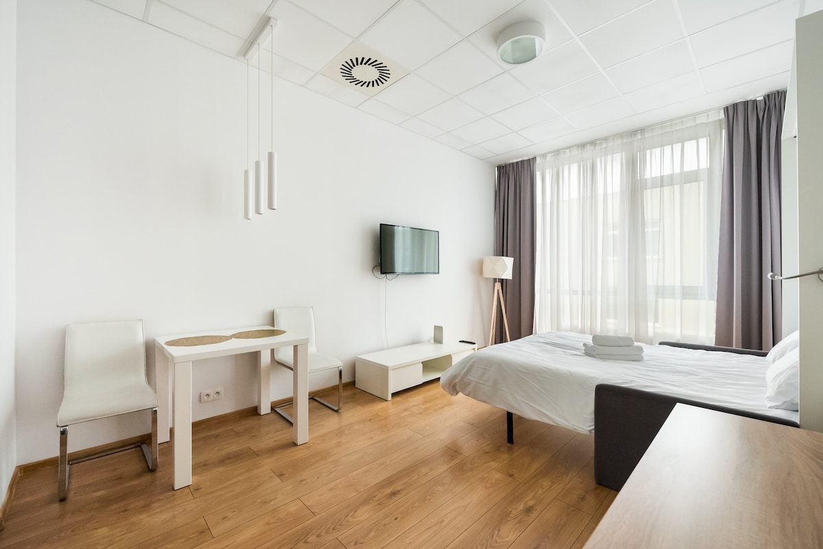 The apartment consists of two bedrooms with a comfortable double bed. In the living room, there is a fold-out sofa that serves as a bed for two people and flat TV with access to VOD services – perfect for evenings together after a day of sightseeing. The fully equipped kitchen offers everything you need to prepare meals – a hob, fridge, microwave, electric kettle and a set of dishes and kitchen utensils. The bathroom has a shower, washing machine and hairdryer.