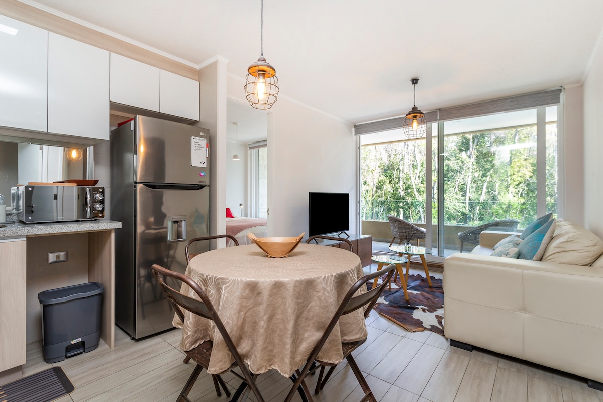 Vieni a Pucón e vivi un'esperienza unica. Questo appartamento con 1 camera da letto e 1 bagno vi accoglie con una spaziosa terrazza e una vista spettacolare sul vulcano Villarrica, ideale per rilassarsi e staccare la spina. Dispone di WiFi ad alta velocità e Smart TV, così non perderai le tue serie o film preferiti. Posizione ideale: vicino a ristoranti, lago, sorgenti termali e attività all'aperto. A soli 5 minuti dal centro in auto o Uber, o a 1 km a piedi.