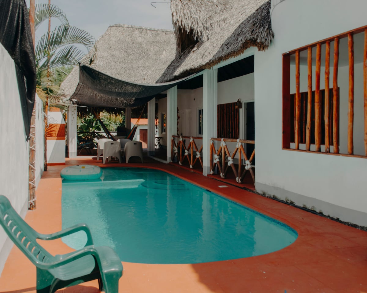 Benvenuto nella tua casa accogliente e indipendente nel vivace cuore di Puerto San Jose. Questo spazio luminoso dispone di una cucina completamente attrezzata (fornelli, forno, forno a microonde, frigorifero) e di un bagno privato pulito e scintillante, piscina all'aperto, vasca idromassaggio, biliardino, grill per quei deliziosi barbecue.