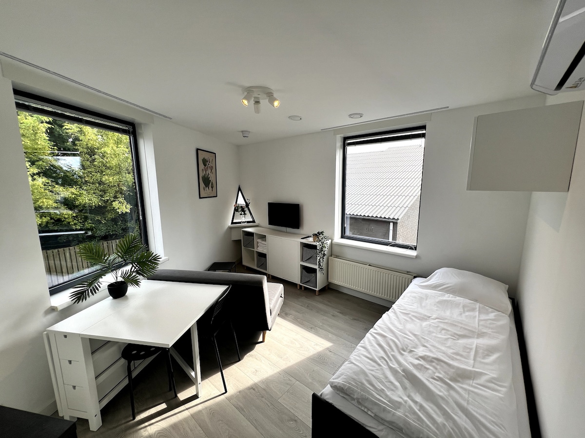 Hai bisogno di un posto caldo per te? Rilassati in questo spazio tranquillo ed elegante. Questo monolocale/mini-casa si trova all'interno della nostra fattoria. Dal balcone si gode della vista sul fiume Mosa. Vivi nel nostro cortile con gli animali e in estate con qualche ospite in più che soggiorna in roulotte. È tranquillo, ma non silenzioso. Quindi si può davvero sentire un'auto, che passa attraverso il nostro bagno o il tosaerba dei vicini. La gente della città trova questo posto tranquillo!