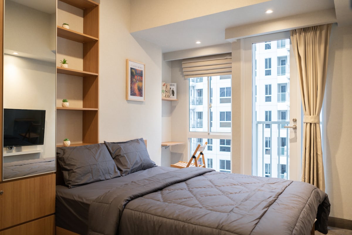 Accogliente monolocale di recente arredamento @PIK 2 Appartamento collegato al Lifestyle Mall In questa nuova area di tendenza PIK 2, puoi facilmente trovare vari tipi di cibo e intrattenimento Informazioni sull'alloggio : - 1 letto a due piazze 160 cm - Set da cucina ( con piano cottura elettrico e mini frigorifero ) - SMART TV per Netflix - Scaldabagno - Asciugamani puliti 🩷 ottieni un prezzo speciale se prenoti più di 3 notti! chattaci 🩷 Questa unità è ben curata, ti sentirai a tuo agio quando soggiornerai qui. *Piscina e palestra non incluse