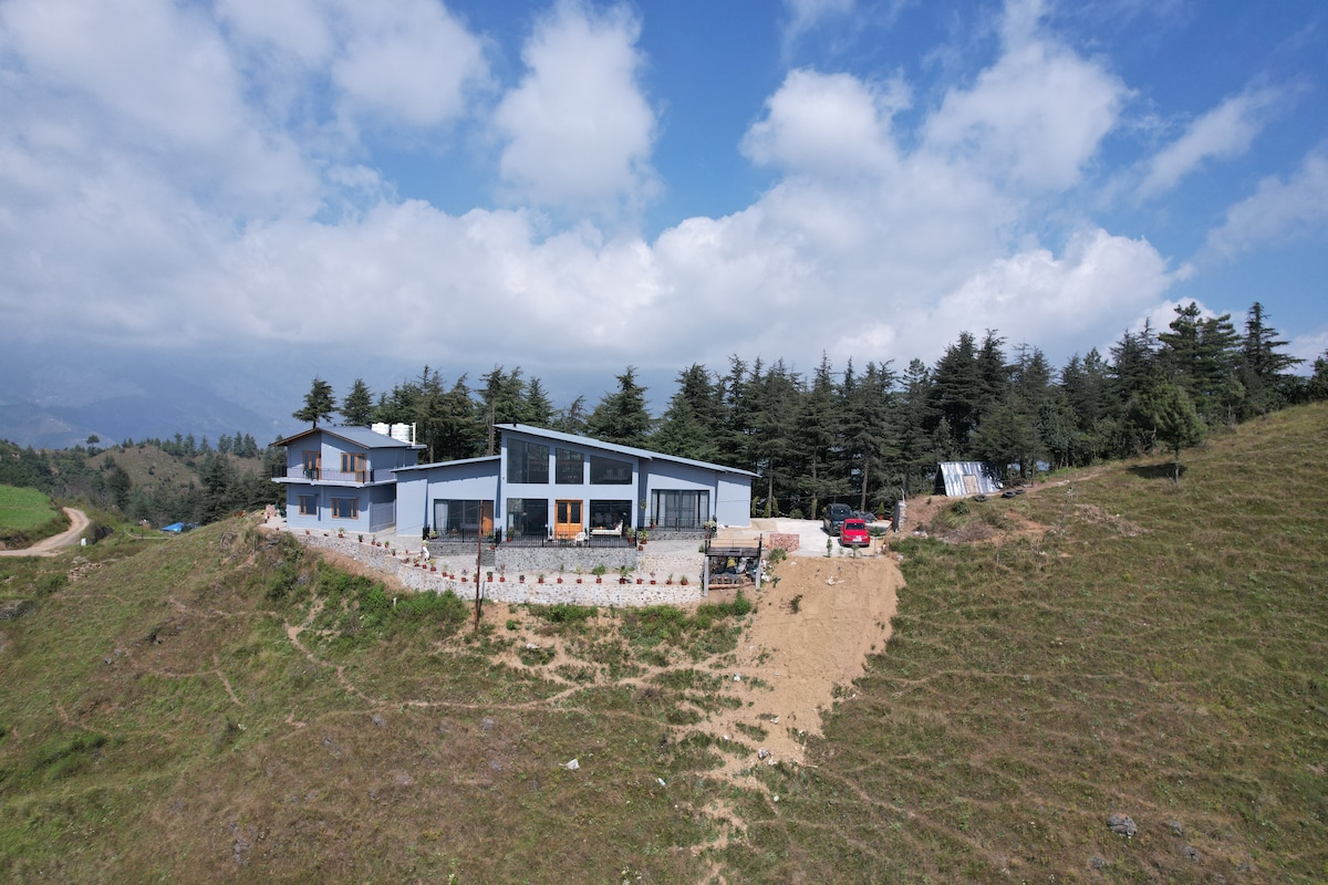 A secluded 2-bedroom villa in Chakrata, set at 7,500 ft amid deodar forests and sweeping Himalayan valleys. Its double-height glass façade frames shifting mountain hues, while sunlit, wood-and-stone interiors offer warmth and stillness. Slow mornings, cozy evenings, and nearby wonders like Tiger Falls and Budher Caves make it a serene retreat for families or friends seeking quiet and connection.