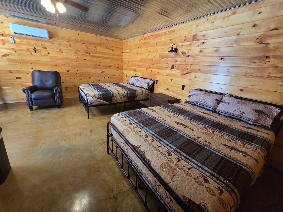 Questa rustica e accogliente baita a tema Cowboy vanta una camera da letto privata con letto matrimoniale, un letto matrimoniale nella zona giorno più 2 sedie che trasformano in letti, una cucina completa, una caffettiera Keurig e normale, tavolo da pranzo, smart TV, wifi gratuito, giochi e dvd. Il bagno completo ha solo una doccia. Goditi l'altalena del portico anteriore, il focolare, la griglia a carbone e i posti a sedere all'aperto. Pesca eccezionale, canottaggio, kayak, escursioni, passeggiate sul sentiero intorno al lago ti aspettano.