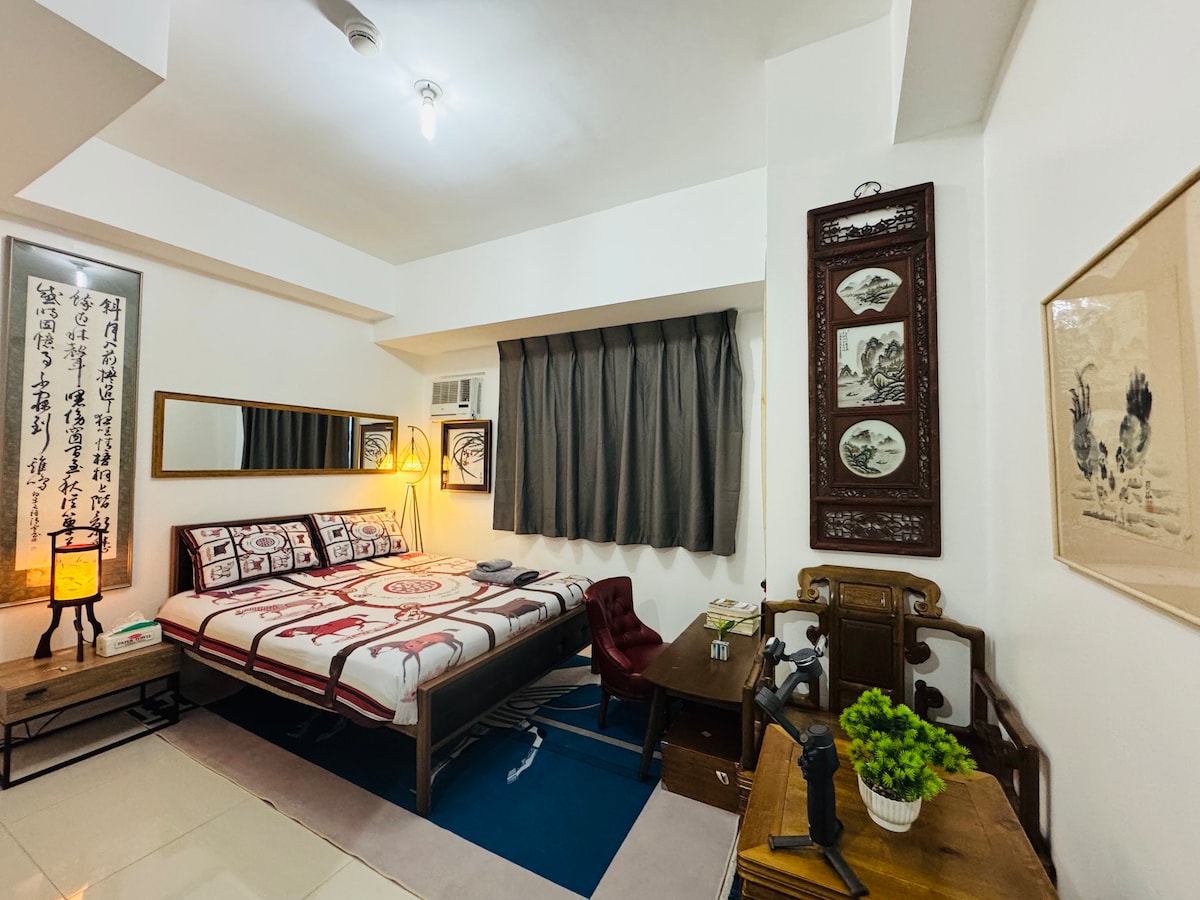 Progettato con cura e con un tocco moderno, questo accogliente monolocale al 43° piano offre comfort e praticità per viaggiatori, coppie o lavoratori a distanza. Goditi mattine tranquille e notti riposanti sopra lo skyline della città. • Comodo letto matrimoniale con lenzuola fresche • Forniamo ferro da stiro e asciugacapelli per la tua comodità • Spazio pulito e accogliente per un soggiorno rilassante • Vicino a Robinsons Place, Intramuros e Luneta Park • Situato proprio di fronte all'ambasciata degli Stati Uniti a Manila