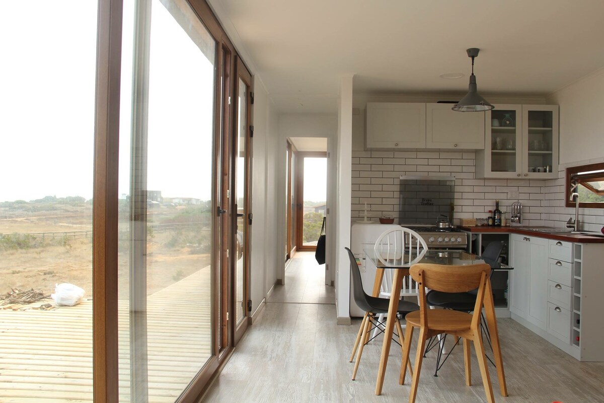 Confortevole casa in condominio ecologico, con terrazza e bella vista sulla grande spiaggia di Tunquén (3 minuti in auto e 15 minuti a piedi). Ha un eccellente isolamento e termopannello per mantenere una temperatura piacevole. L'energia della casa funziona con un potente sistema solare e dispone di acqua di pozzo. È un ottimo posto per riposare e osservare la natura data la sua tranquillità e la poca affluenza di pubblico. Consigliata per coppie e famiglie.
