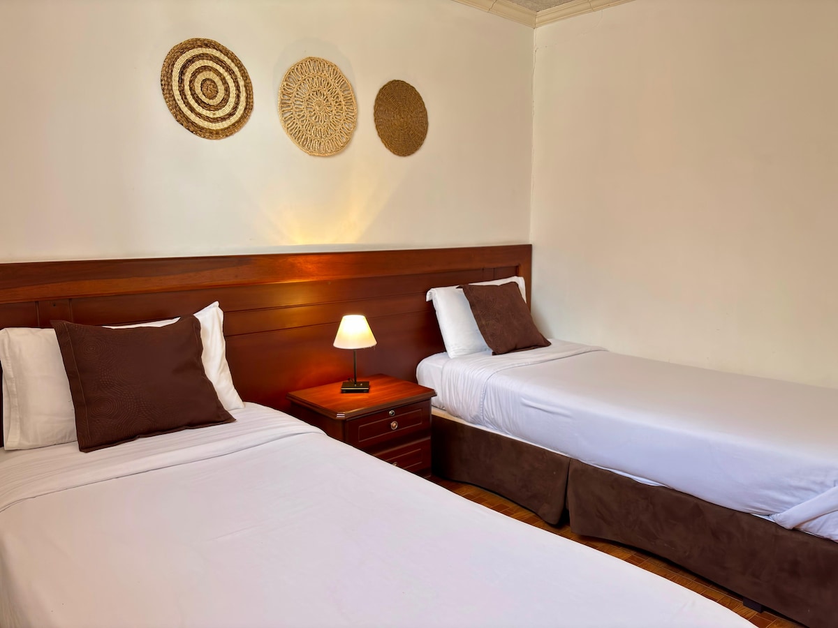 Camera di tipo coloniale moderno, con artigianato e dipinti tipici dell'equatore, recentemente ristrutturati, all'interno di una casa d'altri tempi, colori armoniosi e pensati per un ottimo riposo.