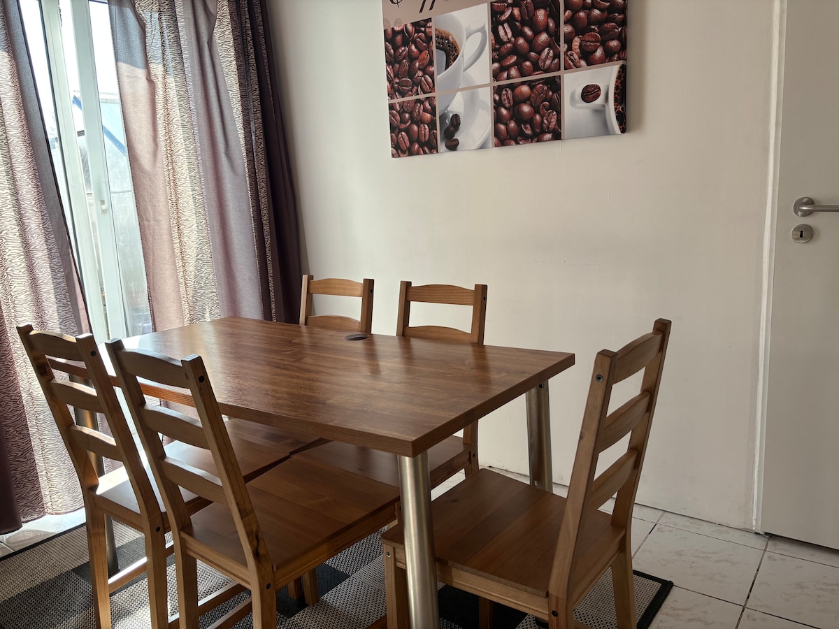Bella casa trilocale completamente attrezzata con giardino privato. La casa è arredata con stile. Comprende una TV, un divano letto nel soggiorno, che è collegato con una cucina attrezzata con elettrodomestici da incasso (frigorifero, forno, forno a microonde, lavastoviglie) compresa una cappa aspirante, un letto matrimoniale e un armadio in ciascuna delle 2 camere da letto. Da una camera da letto e dal soggiorno si accede al giardino con posti a sedere all'aperto. Il bagno è dotato di doccia, WC e lavatrice.