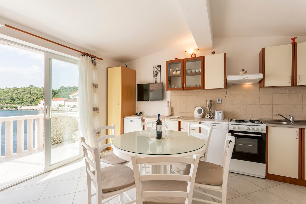 L'appartamento si trova nel piccolo villaggio di Račišće, a 12 km dalla città di Curzola. Dispone di una camera da letto, di un bagno e di una cucina/sala da pranzo. C'è un piccolo balcone con vista mare, barbecue e parcheggio. Ci sono dei gradini dal parcheggio all'appartamento. La spiaggia, il ristorante e il mercato più vicini sono raggiungibili a piedi.