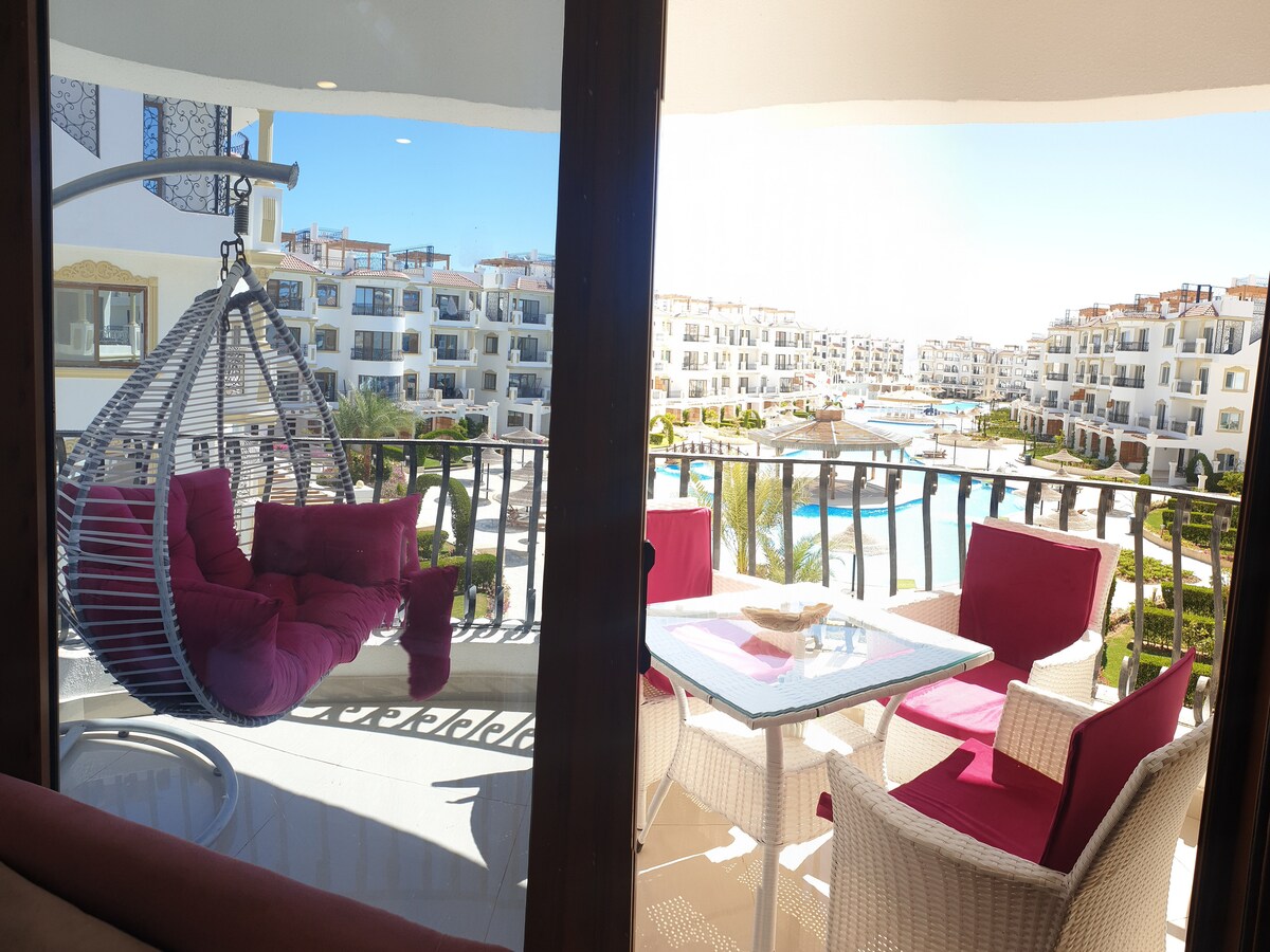 Апартаменти розташовані біля моря, неподалік пляжу з кораловим рифом Червоного моря. Дорога до аеропорту займає близько 15 хвилин. Поруч — Soho Square з ресторанами, магазинами та прогулянковими зонами. Квартира знаходиться на першому поверсі та має прямий вихід до басейну, що зручно для відпочинку біля води протягом дня. У районі іноді можуть проводитися будівельні роботи, тому вдень можливий шум. Уранці та ввечері зазвичай тихо й спокійно.