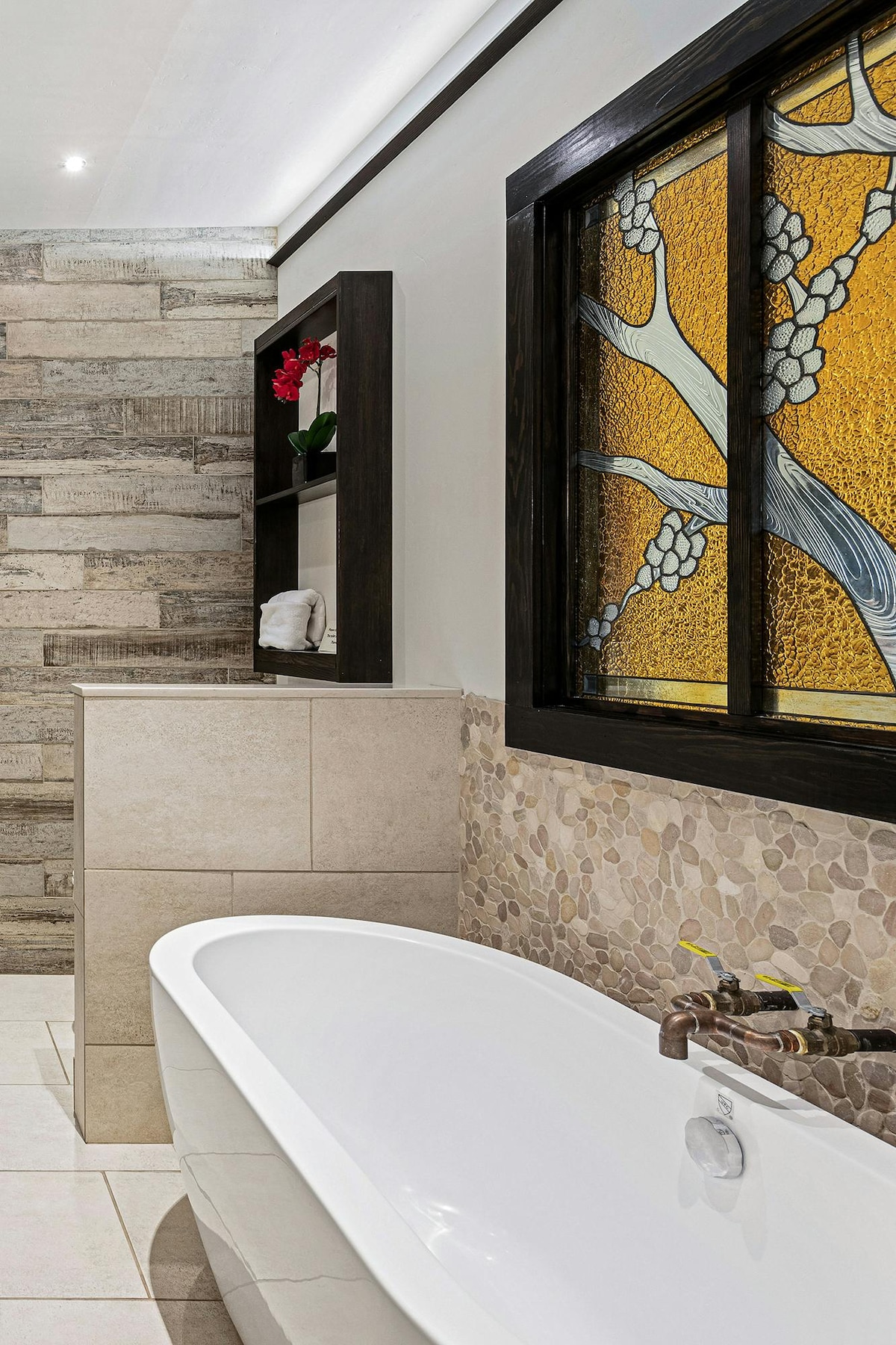 Un rifugio tranquillo e immerso nella natura, progettato per gli ospiti che cercano lusso tranquillo e calore rustico. Ispirata alla bellezza del colibrì di Anna, questa cabina cattura l'essenza di un'eleganza delicata. Vieni a scoprire un interno moderno e accogliente avvolto in ricche tonalità del legno e luci soffuse. I ventilatori in legno fatti a mano si aprono a ventaglio dietro un letto king-size, creando un caldo effetto sunburst che ricorda le ali del colibrì. E un camino in pietra ti invita a rilassarti accanto al fuoco con un libro o un bicchiere di vino.