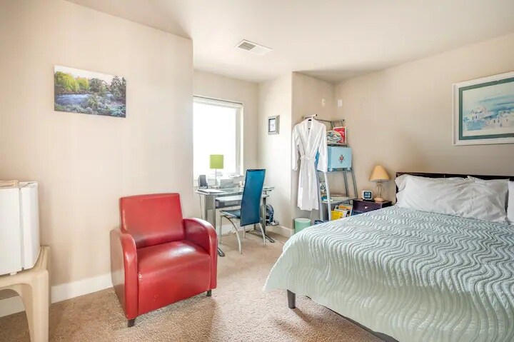 La suite degli ospiti si trova nel centro della città, vicino a quasi tutto. Il monolocale dispone di bagno separato e lavanderia/angolo cottura. Il patio nel cortile recintato dispone di un piccolo stagno che attira molti uccelli. C'è una TV a grande schermo con canali via cavo (compresi quelli sportivi), Netflix e Prime Video. Il letto matrimoniale a scomparsa ha un materasso Purple. Sono presenti un piccolo frigorifero, un tostapane, un forno a microonde, una macchina da caffè Kuerig e un bollitore. Viene fornita la colazione. È possibile prendere in prestito una borsa frigo e asciugamani da fiume.