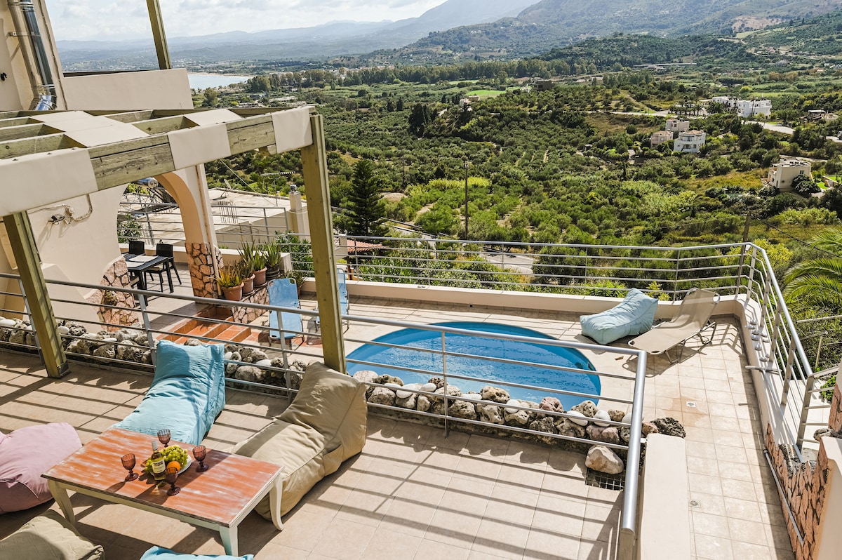Villa Con Vista è una villa di nuova costruzione sulla collina di Tsikalaria, a La Canea, con una magnifica vista sul paesaggio architettonico adattato all'ambiente naturale. L'elegante architettura dell'edificio, che combina elementi come pietra, legno, vetro e arredi minimalisti, offre al visitatore una sensazione di tranquillità e relax. Il tavolo da ping pong e la sauna sono ora a disposizione degli ospiti.