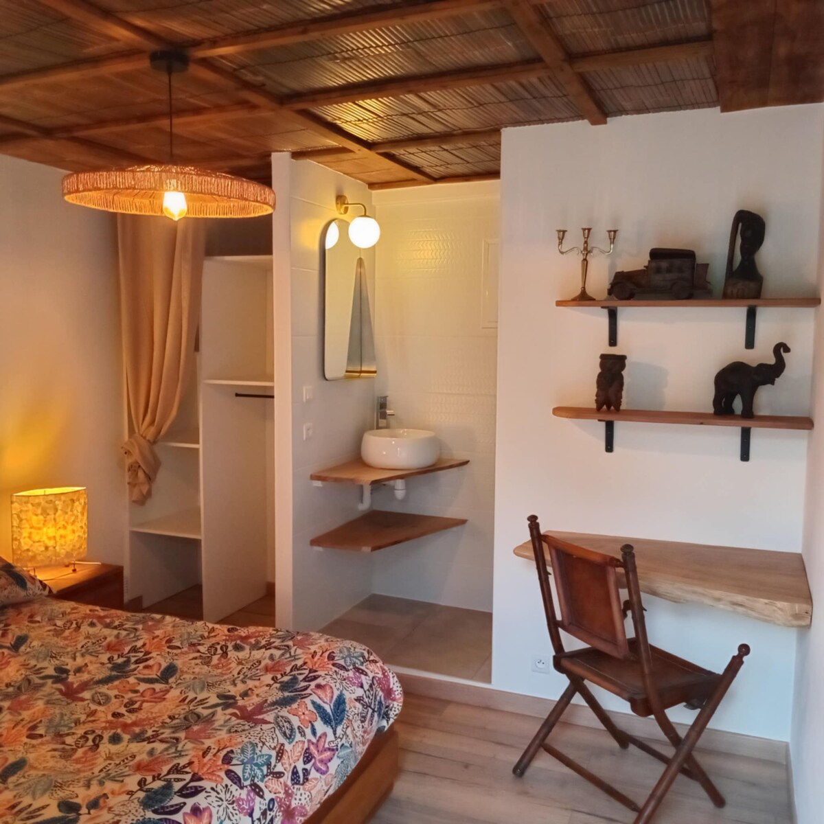 Vieni a goderti questa camera spaziosa e bellissima. Totalmente indipendente (con bagno privato) in una casa di famiglia molto ben posizionata. Un tranquillo luogo naturale a pochi minuti da Saint Pierre, dalla spiaggia e dalle strade principali per le tue visite. Una comoda cucina nel cortile sul retro e un accesso diretto alla nostra piscina in pietra naturale con getti massaggianti per rinfrescarsi e rilassarsi.