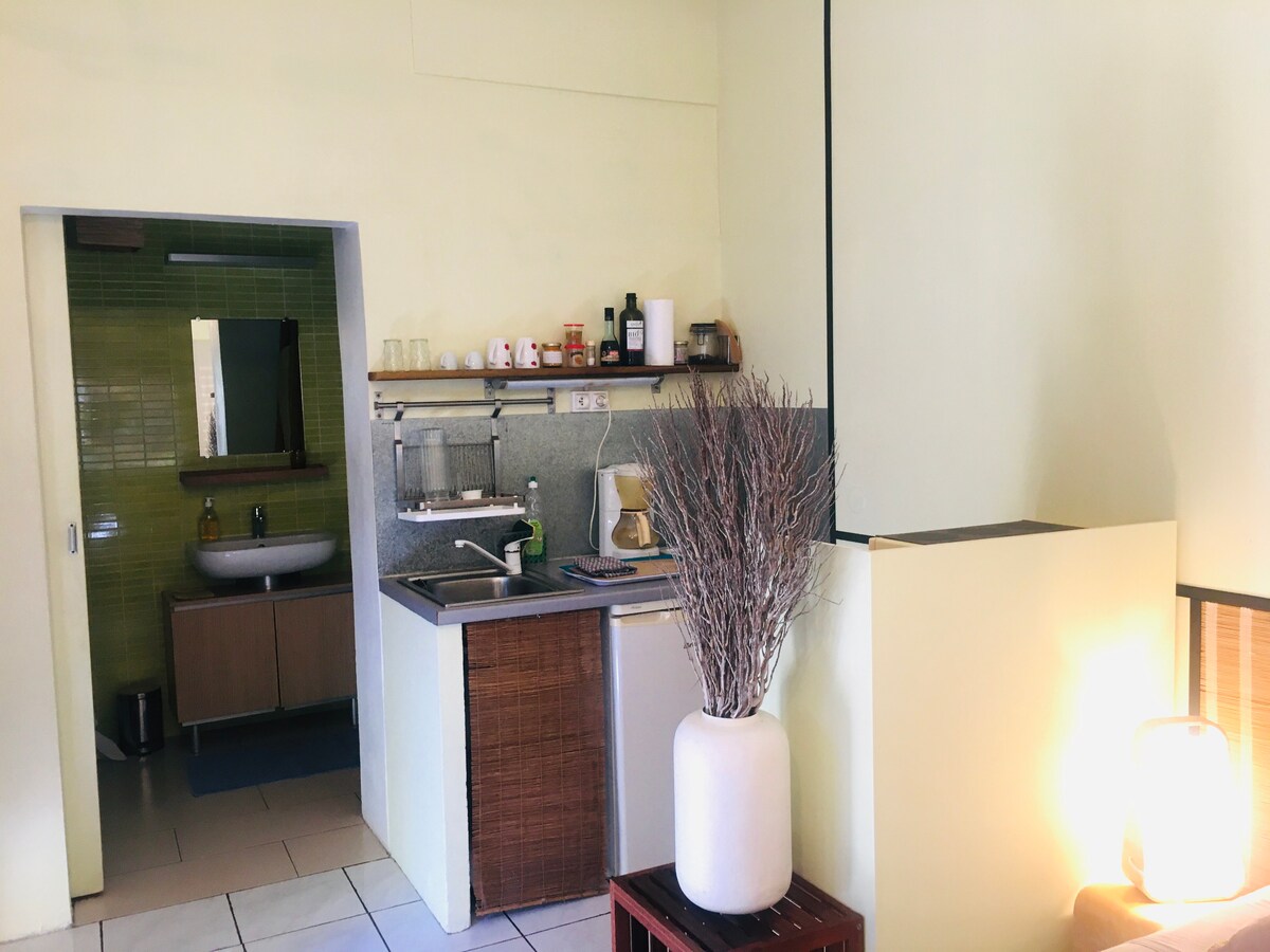 Piano terra indipendente da una casetta su palafitte, in una piantagione di cocco. Previsto per 2 persone, è composto da: - una camera da letto, bagno esterno (acqua calda) e WC, spazio aperto verso l'esterno con angolo cottura attrezzato e giardino con vasca idromassaggio e piscina. Situato in riva al mare nella baia di Saint Paul in una riserva naturale eccezionale (cocco e stagno), vicino al commercio del centro città, al mercato di Saint Paul e alla strada dei Tamarini. Luogo tranquillo.