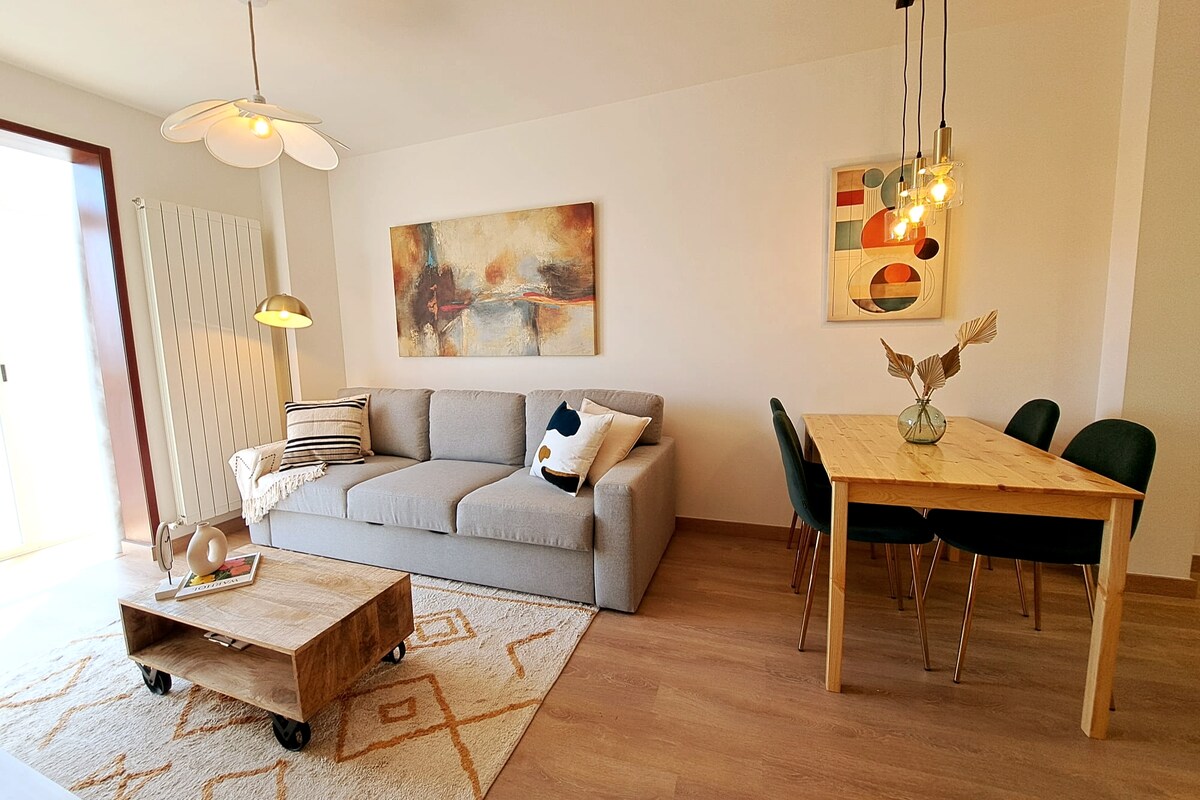 NEW apartment with elevator in the center, with designer furniture and quality. The apartment is composed of TWO bedrooms (150 cm bed), DINING ROOM with sofa bed (elastic mattress viscous 160 cm), BATHROOM with shower and separate KITCHEN equipped with all appliances and utensils that may be needed. Possibility of access to Parking (19,90 / day) and Gym (There are discounts on parking and gym for stays longer than 1 week).