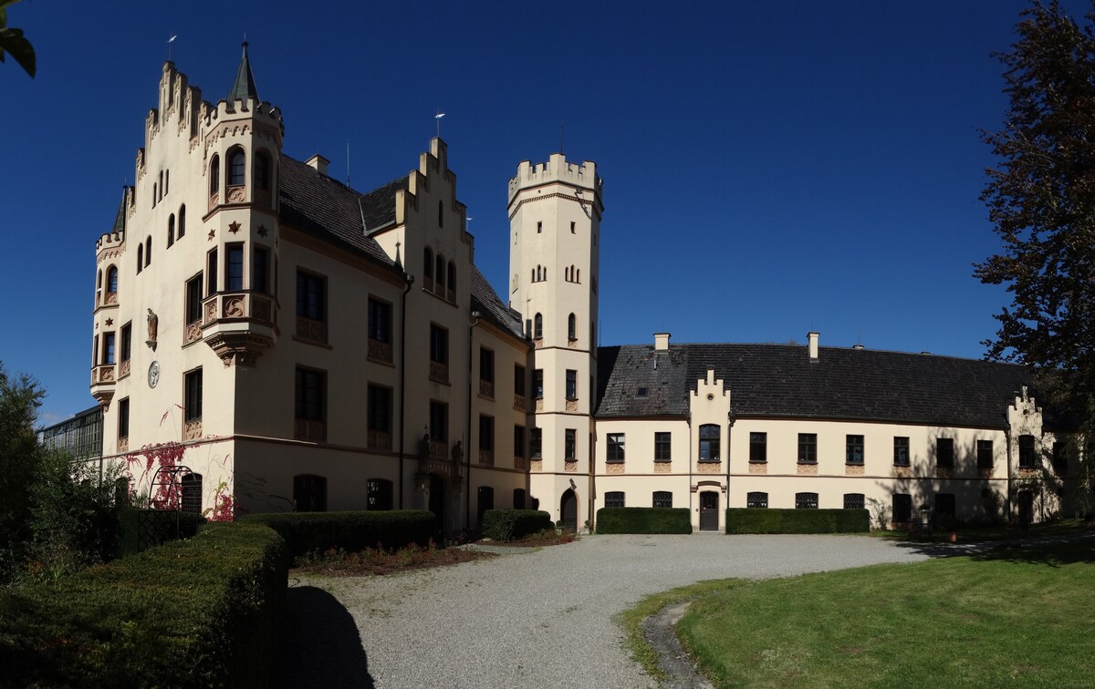 Appartamento privato in un castello di oltre 400 anni. L'edificio storico è in ottime condizioni ed è circondato da 10 ettari di foresta. Si trova a 1 ora di auto da Francoforte sul Meno, nel cuore della "Riserva naturale di Rhön". 2 camere matrimoniali (1-4 persone), un soggiorno, una piccola cucina e un bagno. Attività adatte alle famiglie: - Barca a remi sul grande laghetto privato e campo da tennis utilizzabili gratuitamente - Isola con sala da tè - Molti sentieri escursionistici nelle vicinanze