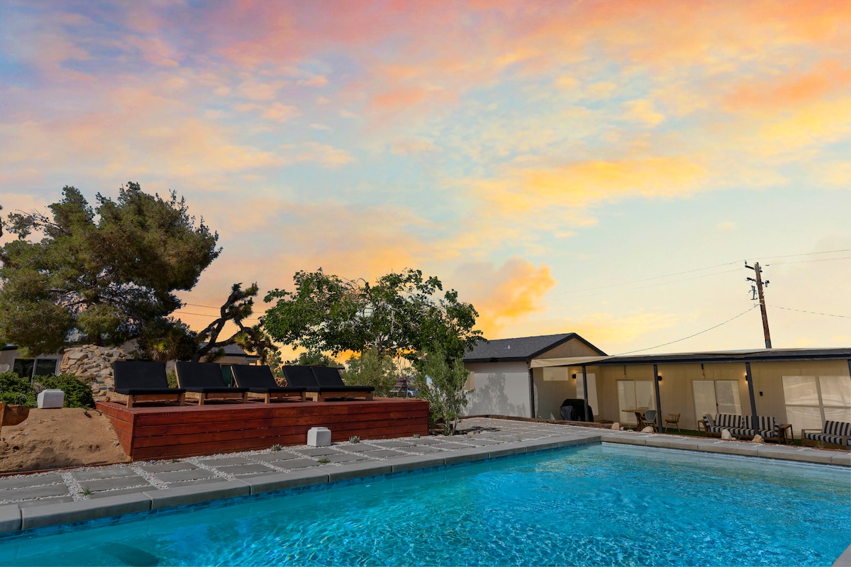 Welcome to The Rockstar By The Cohost Company! ★ 17 private acres ★ Hot tub ★ Cool-dip Cowboy Tub (Unavailable from Nov-March) ★ Propane Firepit ★ Propane Grill ★ Outdoor dining ★ Bubble chair ★ Foosball table ★ 3 en-suite bathrooms in each bedroom ★ Heating/AC ★ Full kitchen ★ 2 bedrooms in the main house ★ 3rd bedroom in the casita ★ Custom lights, furniture, decor, etc. 5 mins ➔ Pappy & Harriet's 5 mins ➔ Pioneertown 10 mins ➔ La Copine 20 mins ➔ Joshua Tree National Park ▵ @thecohos