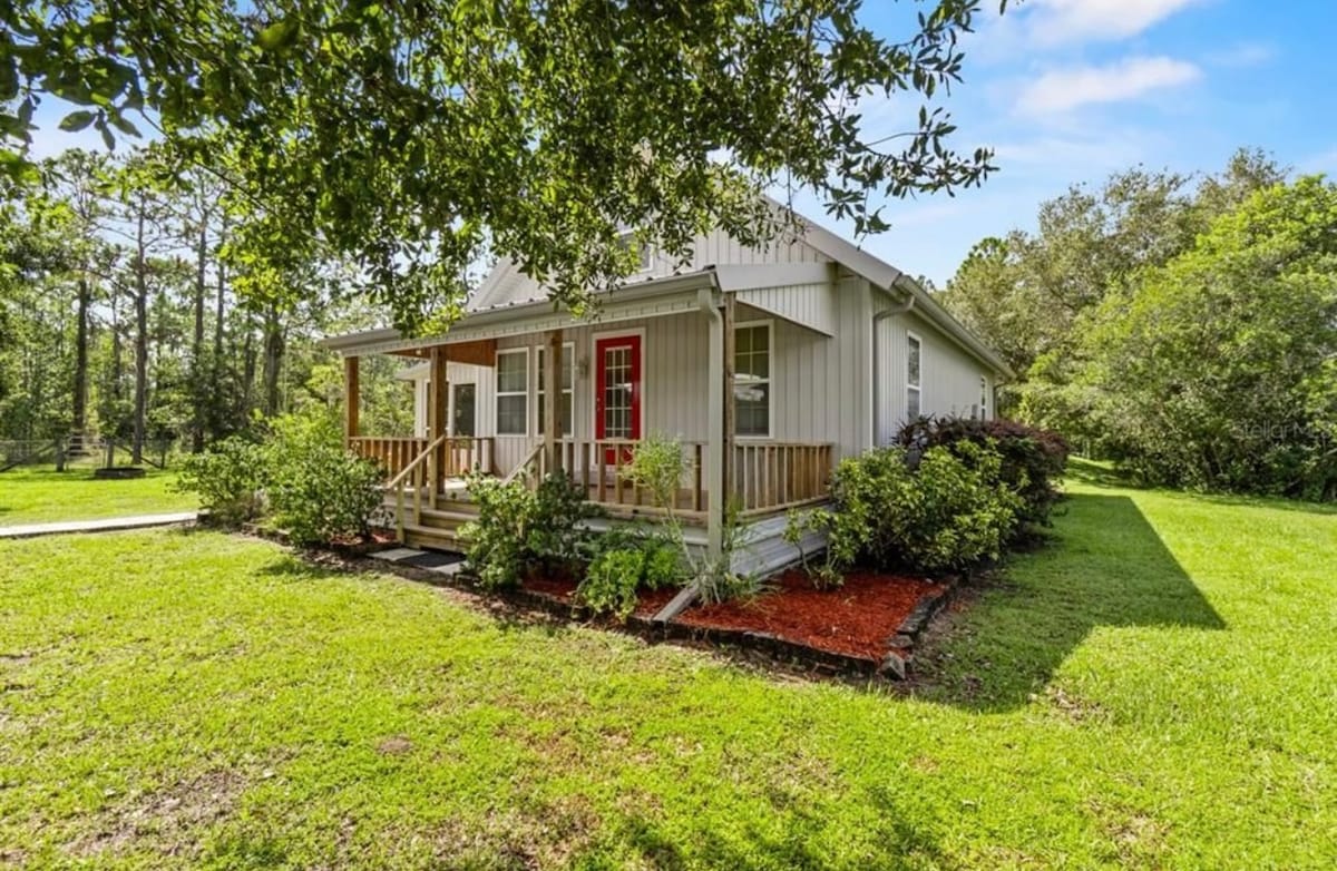 Scopri il fascino della vita di campagna. Immerso in una splendida area protetta e in una zona di gestione della fauna selvatica. Rilassati all'aperto sull'accogliente portico anteriore o goditi la vista dal portico laterale schermato, ideale per il caffè del mattino, serate tranquille o semplicemente immergerti nella natura circostante. All'interno, la casa ha una disposizione accogliente con 2 camere da letto, al piano di sotto con letti queen size e 2 camere da letto al piano superiore con letti a due piazze. Rampe per barche a pochi minuti di distanza. A 45 minuti da Legoland. A 20 minuti da River Ranch.