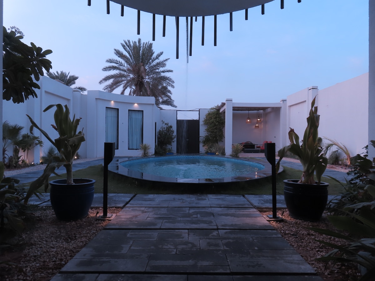 Affitta uno chalet di lusso ad Al Ramal Goditi un'atmosfera unica in un elegante chalet che ti offre privacy e comfort, perfetto per famiglie e riunioni. Caratteristiche: Lounge per 9 persone Cuffie e wifi Mini tavolo da pranzo Piscina privata Sessioni all'aperto Camere accoglienti Cucina attrezzata Parcheggio privato