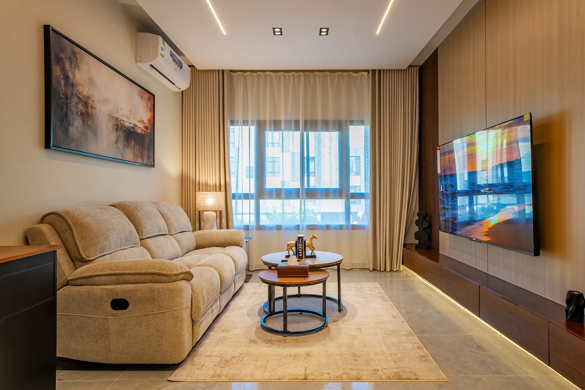A one-bedroom apartment with a living room. The living room features a 75-inch high-definition screen with IPTV service, providing an immersive viewing experience. A comfortable sofa ensures maximum relaxation, complemented by soft ambient lighting that creates a calm and peaceful atmosphere. The bedroom includes a medical-grade bed with a luxurious hotel-quality mattress topper, offering the perfect blend of comfort and high-quality sleep.