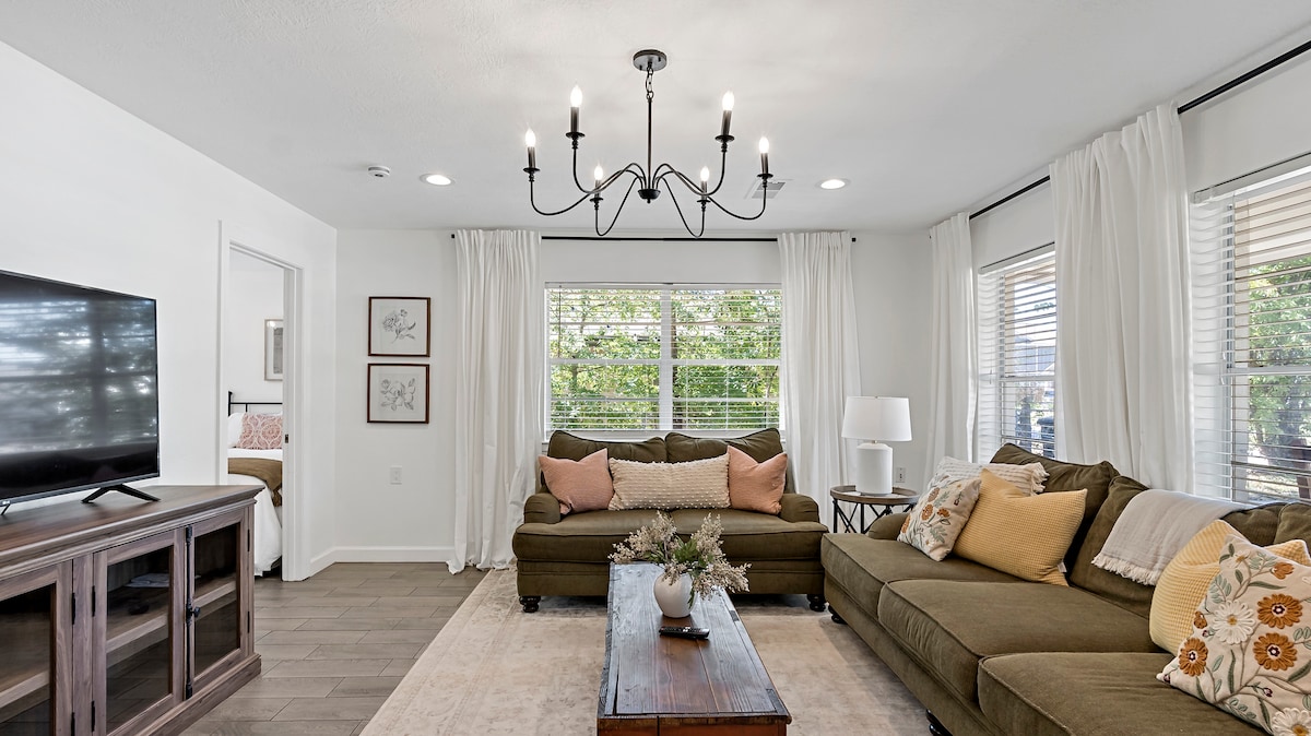 Rilassati in una nuovissima casa a schiera "Mid Century Modern" situata nel centro storico di Bryan e a pochi passi da Ronin, Black Water Draw, RX Pizza, the Village, Cilantro e molti altri ristoranti. La camera da letto principale ha un letto king-size e ogni stanza ha una Smart TV da 58 pollici. Accedi al tuo account di streaming personale o usa il nostro Hulu, Disney o ESPN, come cortesia. Rilassati nel cortile privato con una splendida vista o cucina nella bellissima cucina che include una macchina per caffè Keurig con cialde e creme.