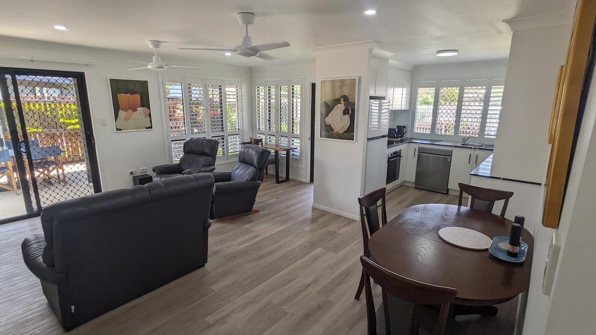 Moderno monolocale climatizzato con letto matrimoniale e divano letto con materasso matrimoniale aggiuntivo, preparato su richiesta. A pochi passi dalle bellissime spiagge locali, dalla piscina lagunare gratuita e da ottimi ristoranti a 15 minuti a piedi, nonché da una graziosa caffetteria e da fish'nchips a Cooee Bay. Parcheggio coperto in strada, Smart TV, WIFI, bagno privato e angolo cottura indipendente con elettrodomestici nuovi. Accesso alla lavanderia e al giardino sul retro con barbecue. Adatto ad animali domestici e bambini. Ampio portico anteriore rialzato.