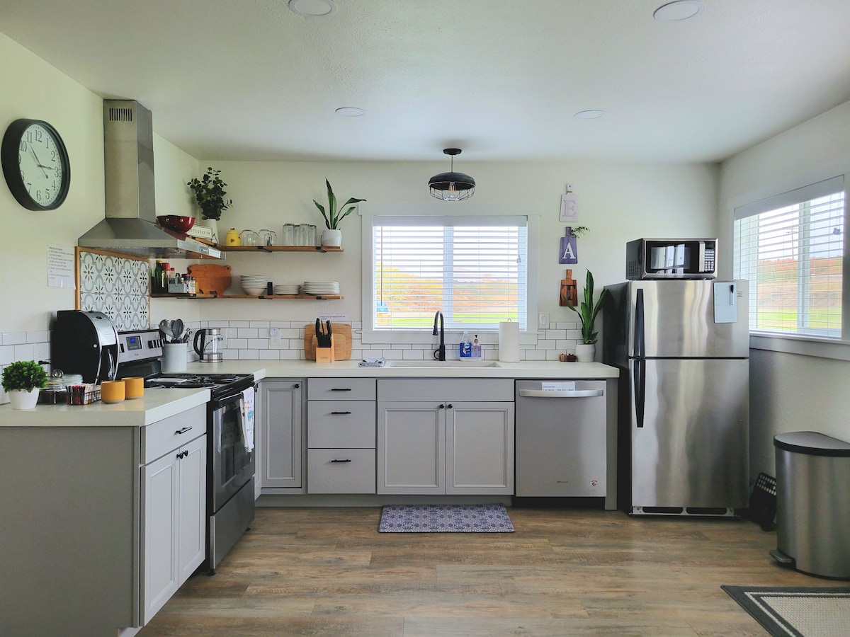 Una casa mobile doppia situata a 1,6 km dalla 76/BirdShack/DQ nella città di Goldendale, si trova su un terreno di 4 ettari con laghetto. Abbiamo 5 pesci koi qui, non è consentito pescare né nuotare. Non è consentito pattinare durante il mese invernale, quando lo stagno è ghiacciato e scivoloso. Il golf cart è temporaneamente fuori servizio. 3 camere da letto, ha 2 letti matrimoniali e 1 letto completo. Dispone di 2 bagni. L'intera cucina è funzionale, con spezie, forno, frigorifero, macchina per il caffè, tostapane, forno a microonde, ecc. Tavolo da pranzo e sedie all'altezza del bancone per sei persone.