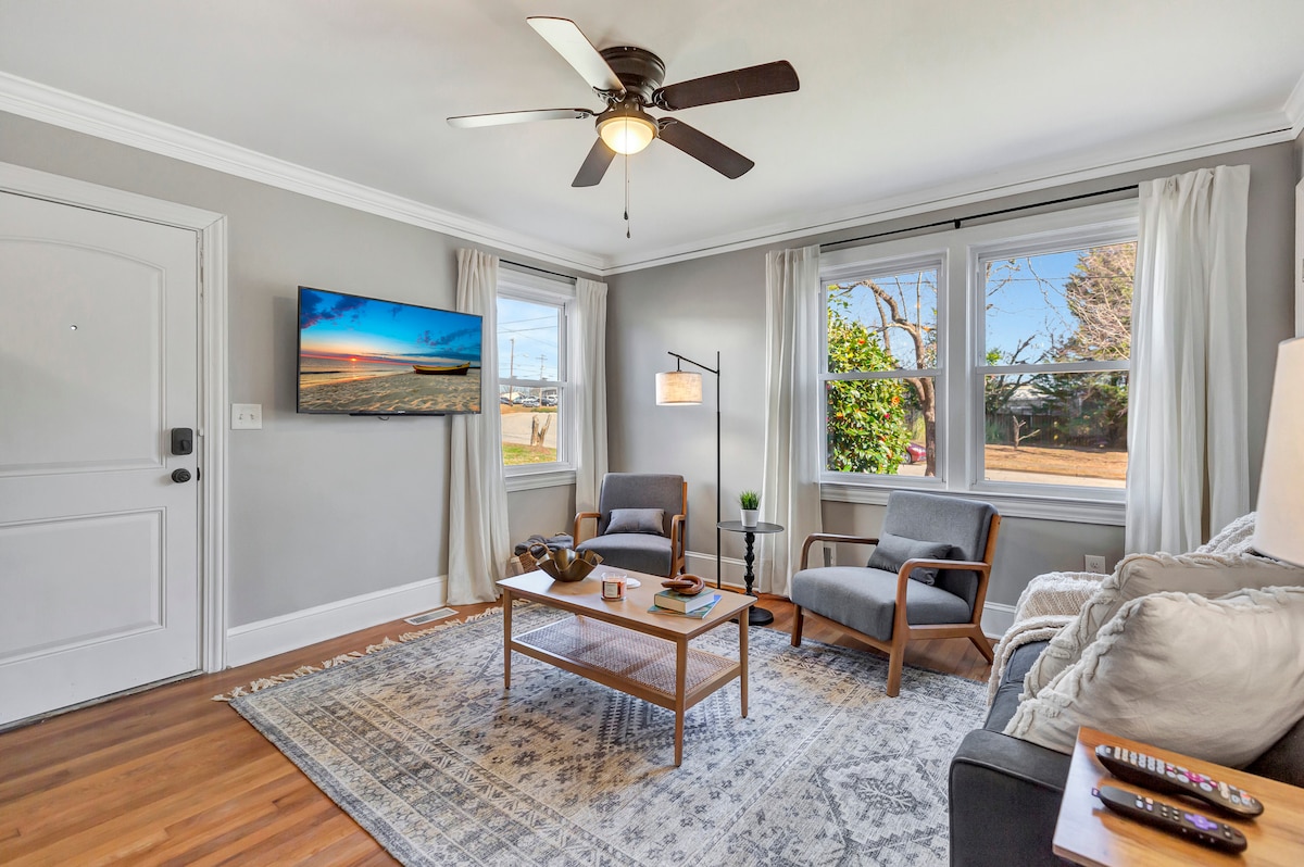 Goditi il tuo soggiorno in questa incantevole casa aggiornata a 1 miglio da Main St Greenville! Fai una passeggiata nel quartiere storico di Pinckney mentre ti dirigi verso i musei, i ristoranti, i teatri e lo splendido Reedy River Falls Park di Greenville. Facile accesso al sentiero pedonale e ciclabile dello Swamp Rabbit, e a soli 4 isolati dall'imminente Unity Park. La casa si trova in una tranquilla strada residenziale con vialetto privato. Rilassati su sedie a dondolo sulla veranda o intorno a un braciere portatile in un ampio cortile.